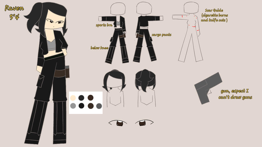LoveShot / LoveShotHeavenRaven has a strong, aggressive personality that makes her seem unapproachable. She doesn't take shit from anyone and isn't afraid to point her gun at anyone who crosses her. Her gun has the ability to use any ammo she wishes, and it usually has water in it. Despite her gun being her main, Raven has mastered all weapons and carries a knife on her. She's impulsive, but she cares for her friends deeply and is quite protective over them. Her relationship with Venus is complicated, but it is obvious the two are very codependent on each other. Raven typically wears a jacket to hide the scars on her shoulders and arms.